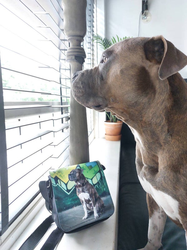 Schattig schoudertasje van 20x20cm. De klep wordt gedrukt met een foto van jouw dier(en). De klep van het tasje sluit met klittenband, onder de klep zit 1 groot vak met een rits.