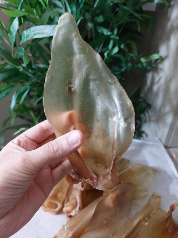 Buffeloren met vlees zijn een aanvullende hondensnack. Met een stuk vlees aan het oor is dit een overheerlijke snack.