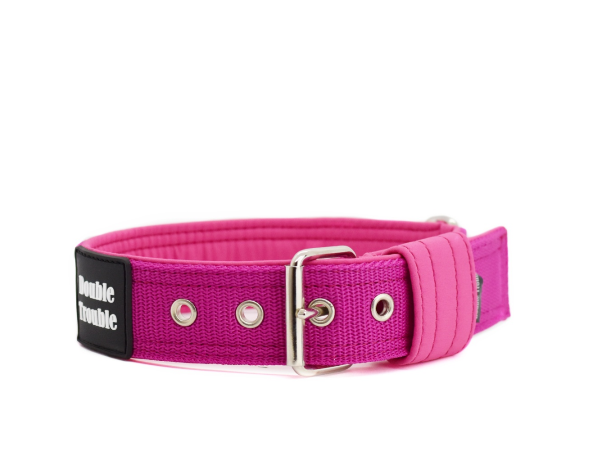 Handgemaakte Double Trouble hondenhalsband gemaakt van extreem duurzaam polypropyleen weefsel met een softshell binnenkant, gemaakt in Slovenië. Het is geschikt voor alle rassen, vooral voor sterkere rassen, zoals American Staffordshire Terrier, Rotweiller, PitBull, Doberman, … Het kan gebruikt worden voor zowel kleinere als grotere honden. De metalen delen op de halsband zijn sterk en massief. De halsband is gemaakt in meerdere lagen en is dik en sterk.
