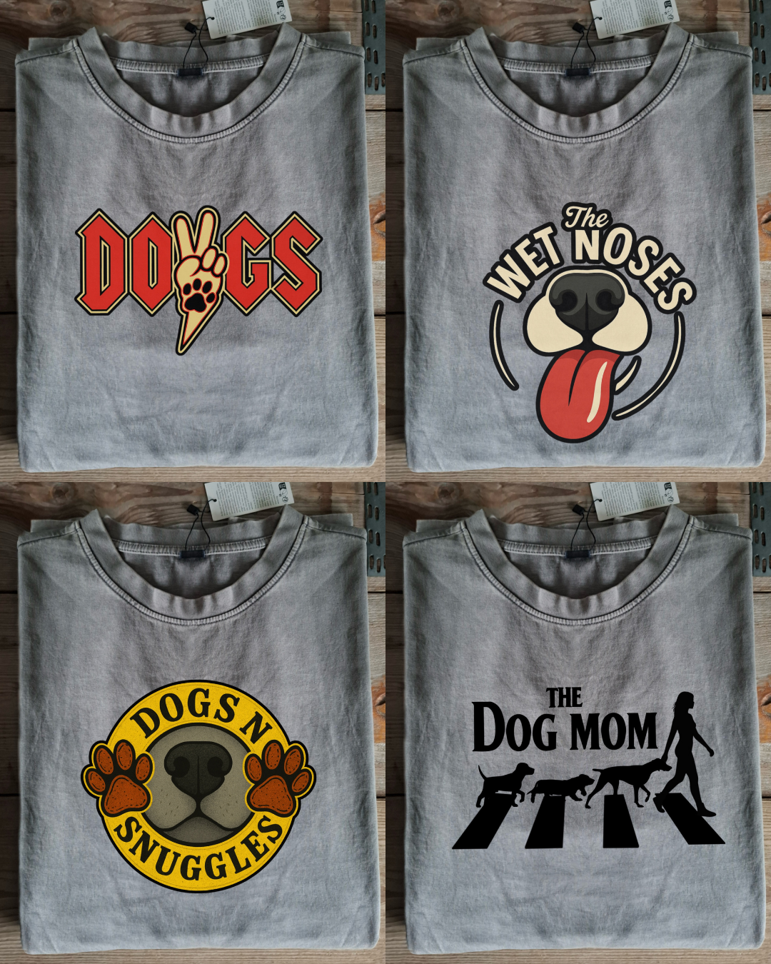 Band shirts maar dan net even anders. Gebaseerd op AC/DC, The Rolling Stones, The Beatles en Guns N Roses, door The Barking Factory omgetoverd tot honden varianten.
