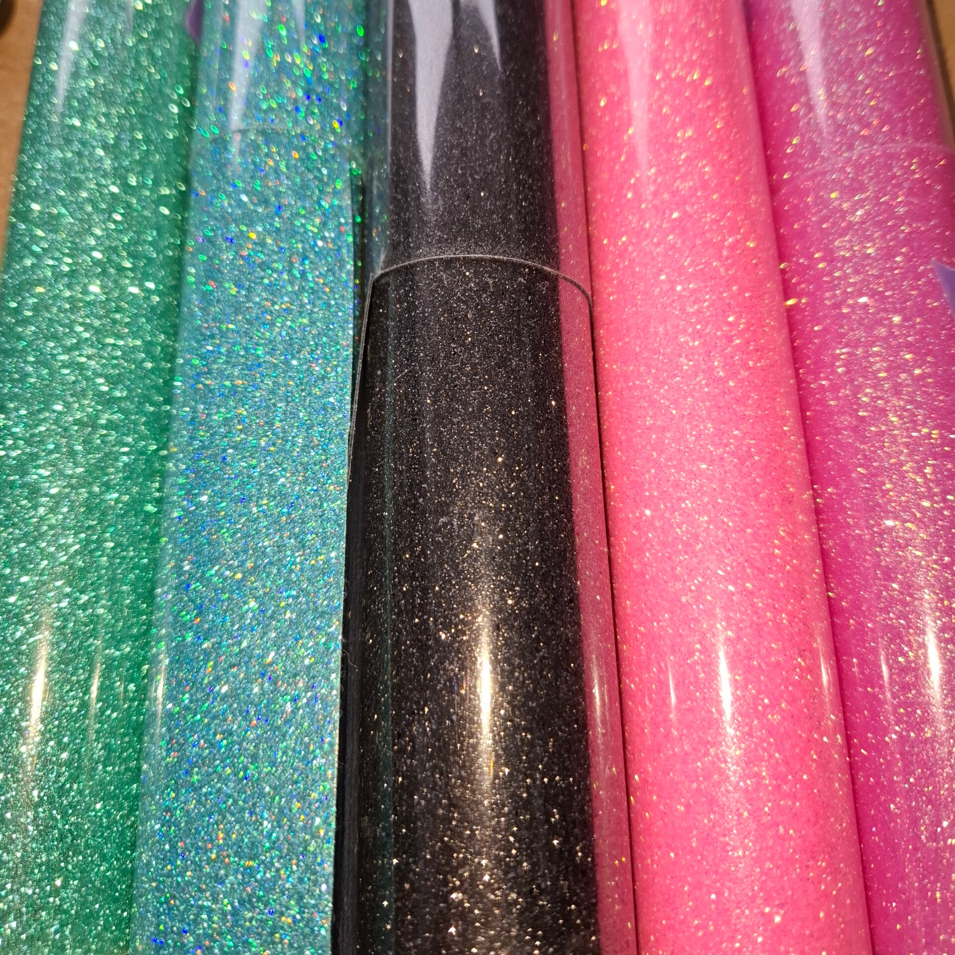 Keuze uit glitter kleuren, van links naar rechts: groen, blauw, zwart, roze, paars