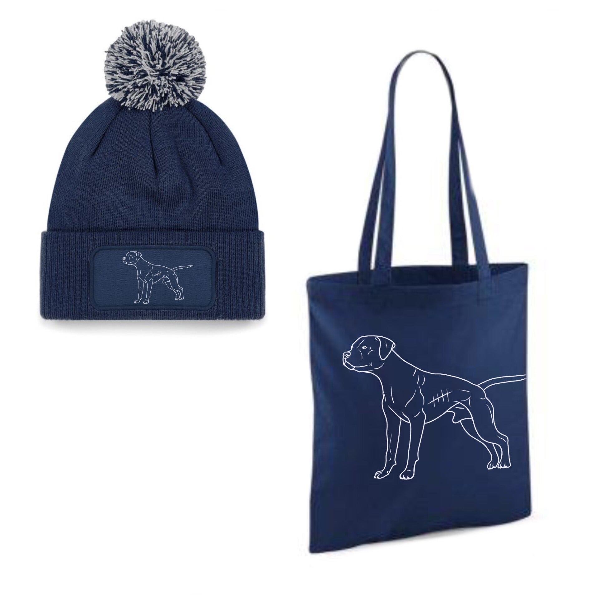 Shop the look! Pompon beanie en katoenen totebag in een navy kleur. Voorwaarde voor deze combi deal is dat beide dezelfde opdruk krijgen.