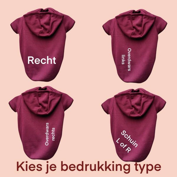 De hoodie kan gepersonaliseerd worden met tekst naar wens. Kies voor tekst op de rug of op de borst. Borst bedrukking wordt afgeraden bij de kleine maatjes ivm de leesbaarheid. Ook bij honden met een hele grote borst is het niet aan te raden te kiezen voor borstbedrukking. Door de hogere rek op de stof zal dat niet mooi worden. Kies in deze gevallen dus alleen voor rug bedrukking.